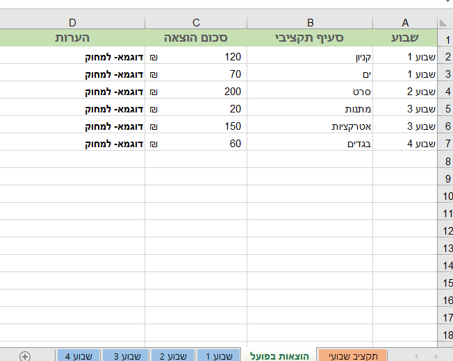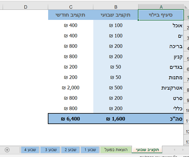 פותחים את גיליון 1 "תקציב שבועי" וממלאים את עמודה B ("תקציב שבועי") לפי סדרי העדיפויות שלכם ומה שמתאפשר.