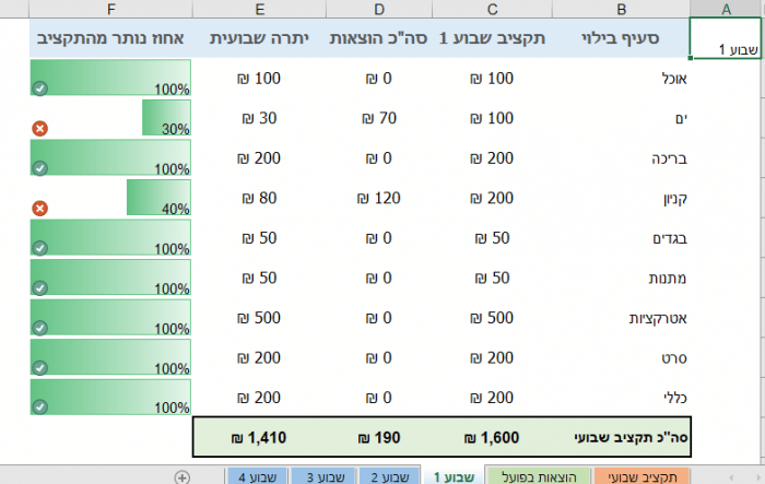 נכנסים לגיליון שבוע 1 עד 4 (לפי הזמן) מתרשמים ממצב התקציב ושומרים את האצבע על הדופק